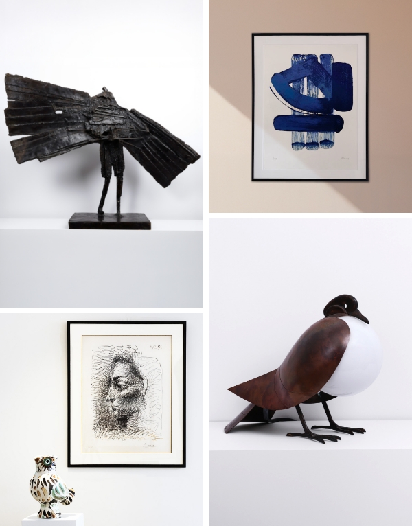 Alongside this selection of artworks, there are also sculptures, ceramics by artists, vases, mirrors, lamps, boxes or jewellery by artists such as César, Man Ray, Arman, Pablo Picasso, Jean Cocteau, Suzanne Ramié, Line Vautrin, Ettore Sottsass and Claude Lalanne, along with Bruno Gambone, Jacques & Dani Ruelland, Gio Ponti and Hans-Agne Jakobsson.