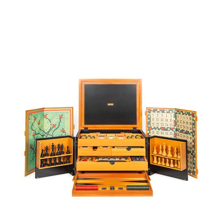 Pomellato & Pierluigi Ghianda, “La scatola dei giochi”, rare boîte à jeux en bois de poirier et poirier noirci, édition limitée, signée et numérotée sur 300 exemplaires, création du modèle en 1982, fin de l'édition en 1999. Ensemble complet comprenant : un jeu d'échecs, un jeu de dames, un jeu de backgammon, six plateaux de jeu sérigraphiés et signés, des jetons, cartes et dés, un livret de Giampaolo Dosseno sur l'historique des jeux.