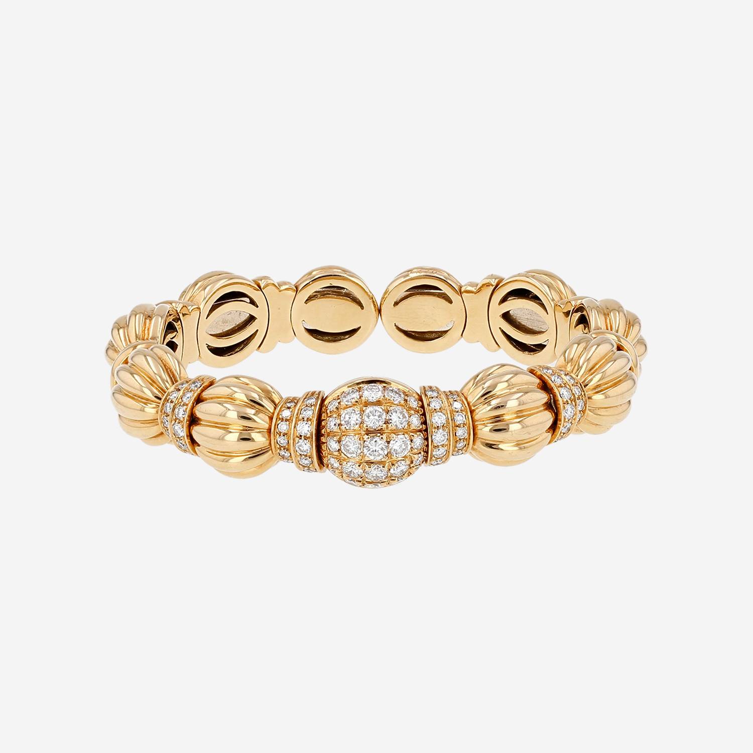 Bracelet époque années 1980 semi-rigide Boucheron en or jaune et diamants, composé d'une succession de beaux motifs bombés godronnés en or jaune, orné au centre d'un superbe pavage en diamants de taille brillant pesant environ 1.10 carat.