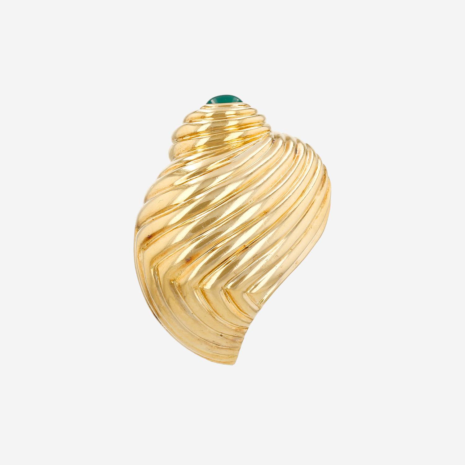 Broche époque années 80 Boucheron en or jaune et chrysoprase, figurant un étonnant coquillage bombé guilloché en or jaune, réhaussé d'un cabochon ovale en chrysoprase.