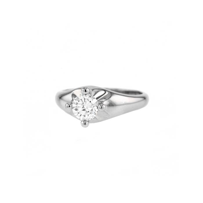 Magnifique bague solitaire en platine, délicatement sertie d'un diamant de taille brillant au total 0.70 carat, réhaussée d'une très belle monture en chute bombée.