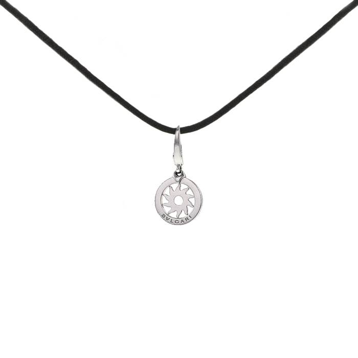 Charmant pendentif Bulgari en or blanc, stylisant un beau soleil en or blanc, orné d'une élégante bordure lisse, réhaussé d'une bélière en or blanc, le tout retenu par un beau cordon en nylon noir.