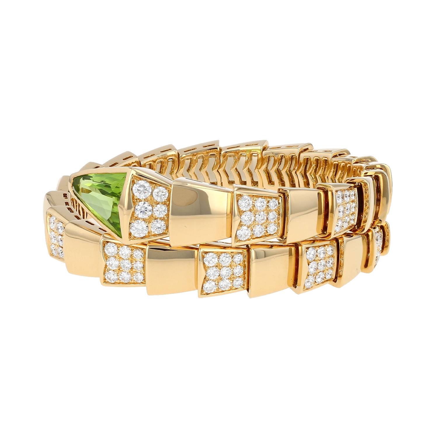 Bracelet Bulgari Serpenti Viper grand modèle en or rose, en diamants, et en péridot, stylisant un serpent semi-articulé mouvementé en or rose partiellement serti de diamants de taille brillant 4.70 carats de environ, orné d'un beau péridot.