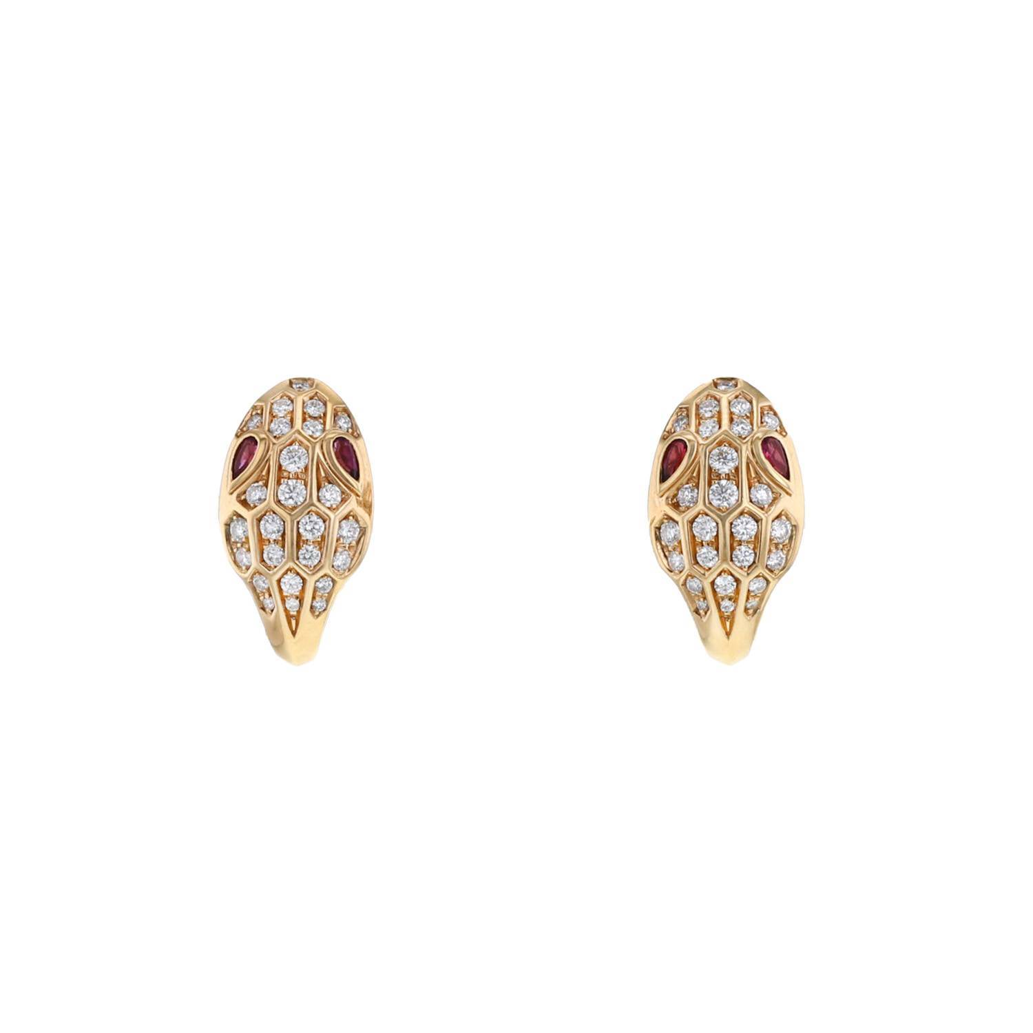 Paire de boucles d'oreilles Bulgari Serpenti en or rose, en rubellites, et en diamants, figurant de beaux serpents en or rose délicatement sertis de diamants de taille brillant d'environ 0.50 carat au total, les yeux ornés de rubellites taille poire.