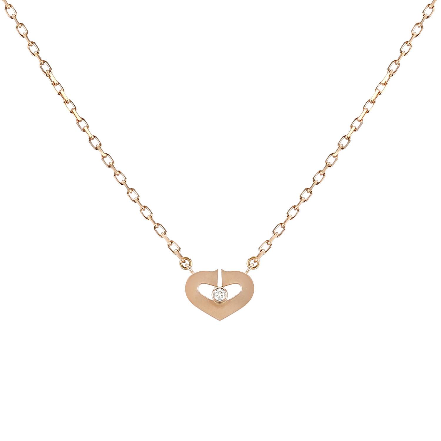 Collier Cartier C de Cartier en or rose et diamant, stylisant un ravissant petit cœur ouvert en or rose, réhaussé en son centre d'un diamant de taille brillant de 0.01 carat, retenu par une chaine à maillons forçat en or rose.