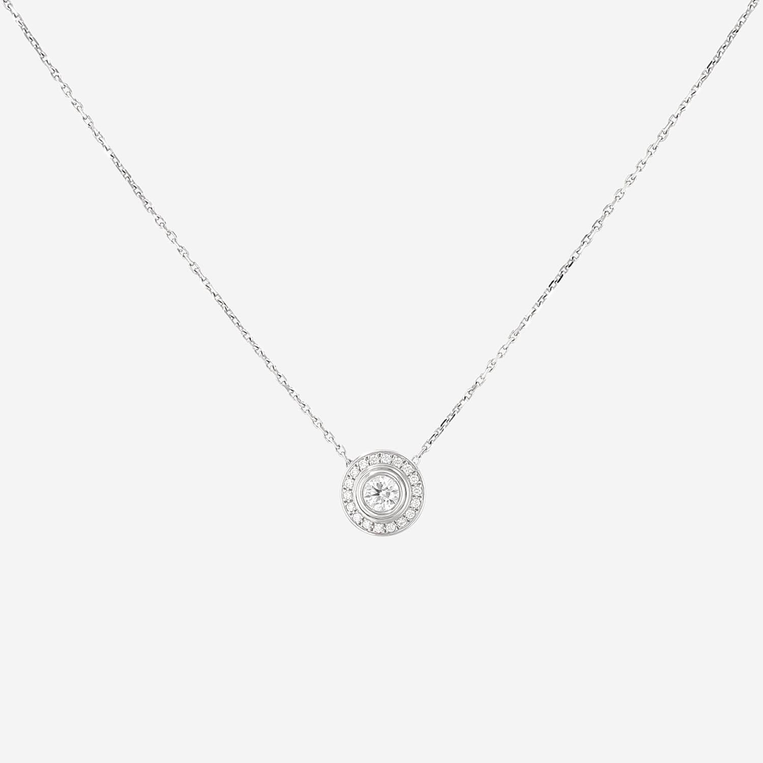 Collier Cartier Cartier d'Amour en or blanc et diamants, composé d'une fine chaine à maillons forçat en or blanc, retenant en son centre un motif rond délicatement serti de diamants de taille brillant de environ 0,10 carat, réhaussé d'un diamant de taille brillant de 0,20 carat, réhaussé sur le fermoir de l'indémodable double C Cartier.