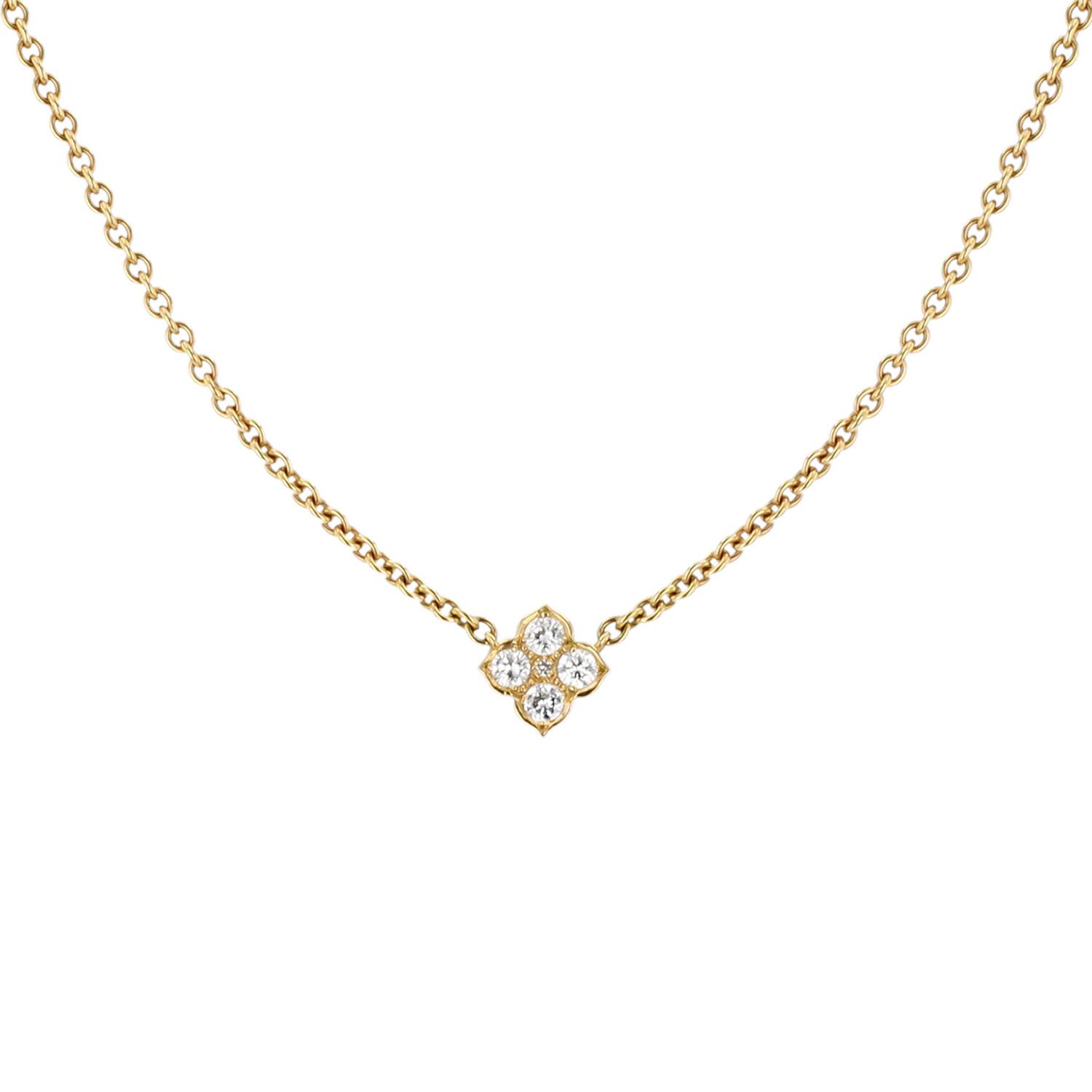 Collier Cartier Inde Mystérieuse en or jaune et diamants, stylisant une belle fleur quadrilobée délicatement pavée de diamants de taille brillant 0.40 carat de environ, retenu par une chaine à maillons ronds en or jaune.