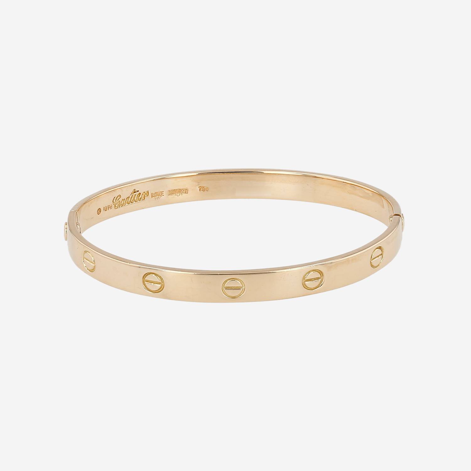 Bracelet époque années 1970 Cartier Love en or jaune, composé d'un élégant bandeau lisse, orné de motifs de vis gravés.