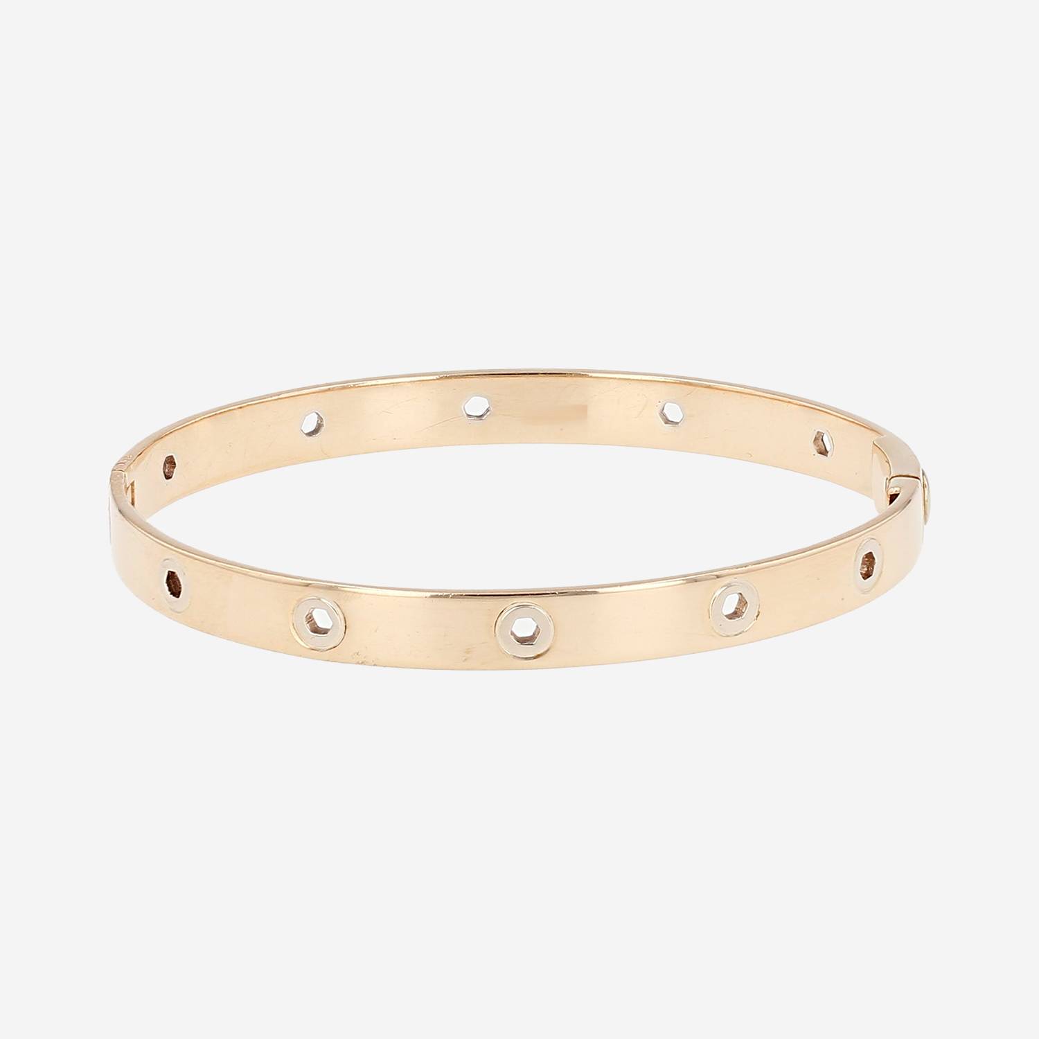 Bracelet Cartier années 1960's en or jaune et or blanc, composé d'un bandeau lisse en or jaune, orné d'une succession de motifs en or blanc réhaussés d'hexagones ajourés.