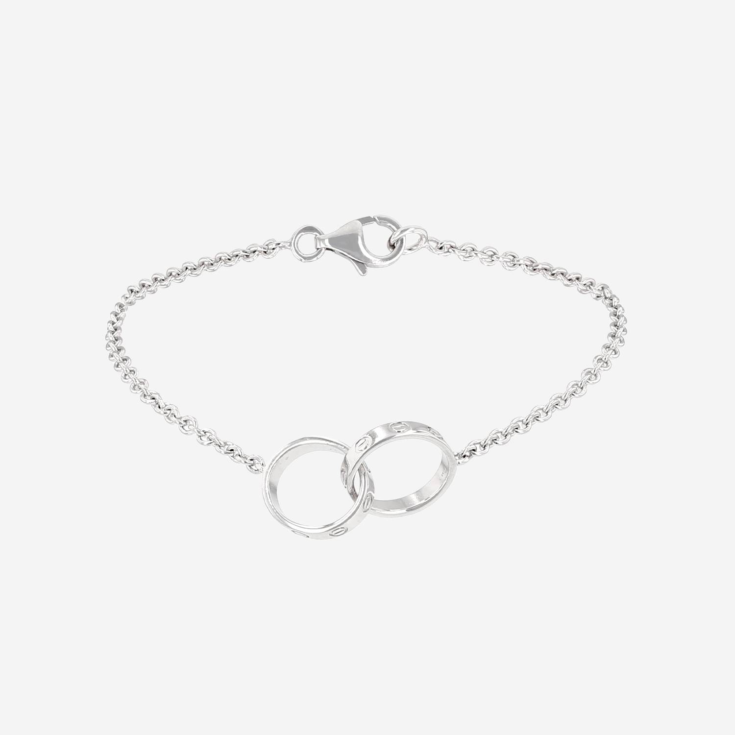 Bracelet Cartier Love en or blanc, composé de 2 élégants anneaux entrelaçés, orné de motifs de vis gravés, retenu par une chaine en or blanc.