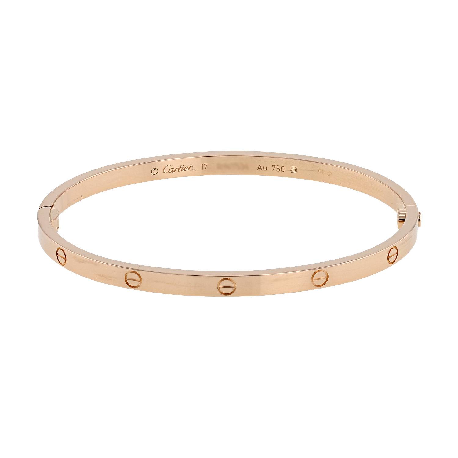 Bracelet Cartier Love petit modèle en or rose, composé d'un élégant bandeau lisse en or rose, orné de motifs de vis gravés.