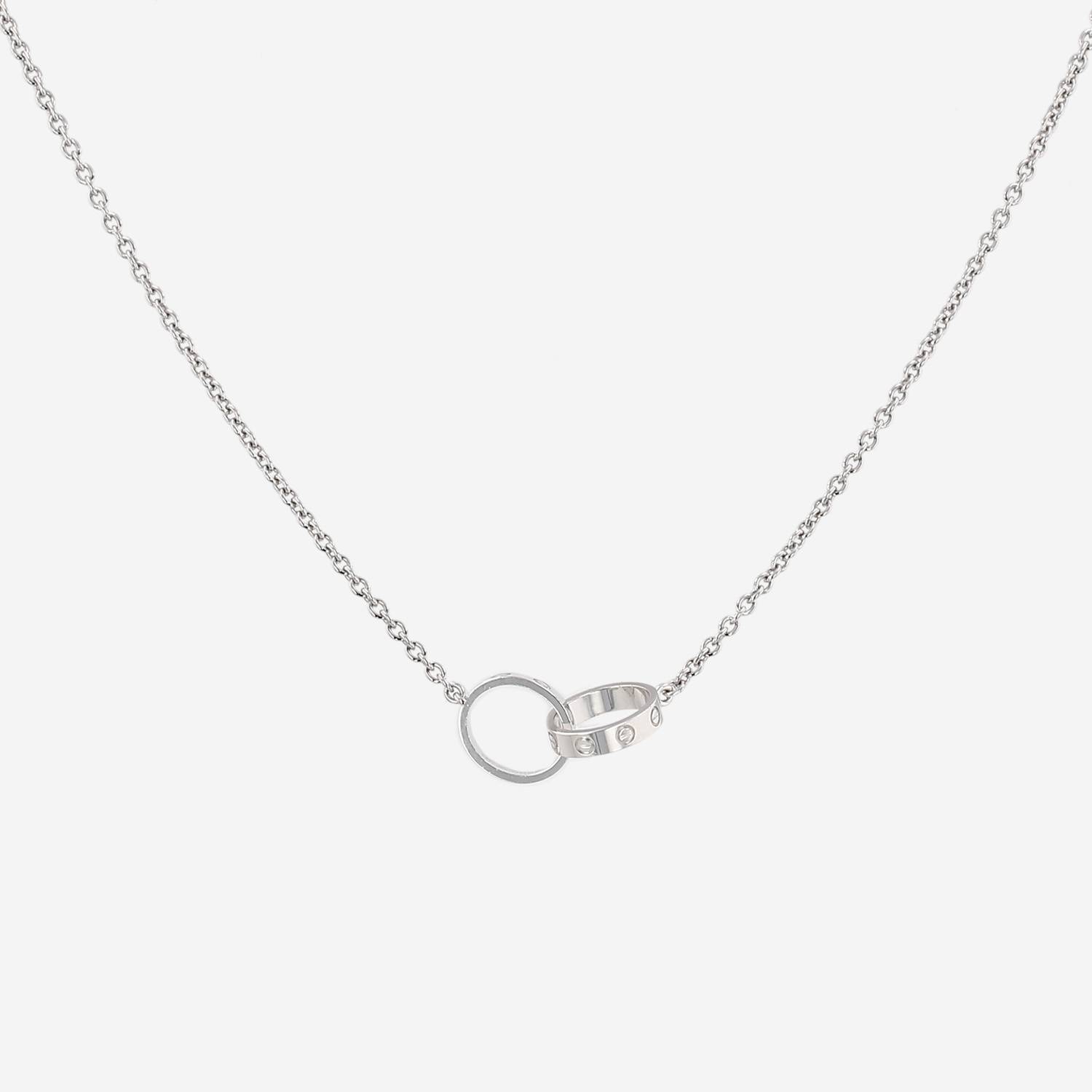 Collier Cartier Love en or blanc, composé de 2 élégants anneaux entrelaçés en or blanc, orné de motifs de vis gravés, retenu par une belle chaine en or blanc.