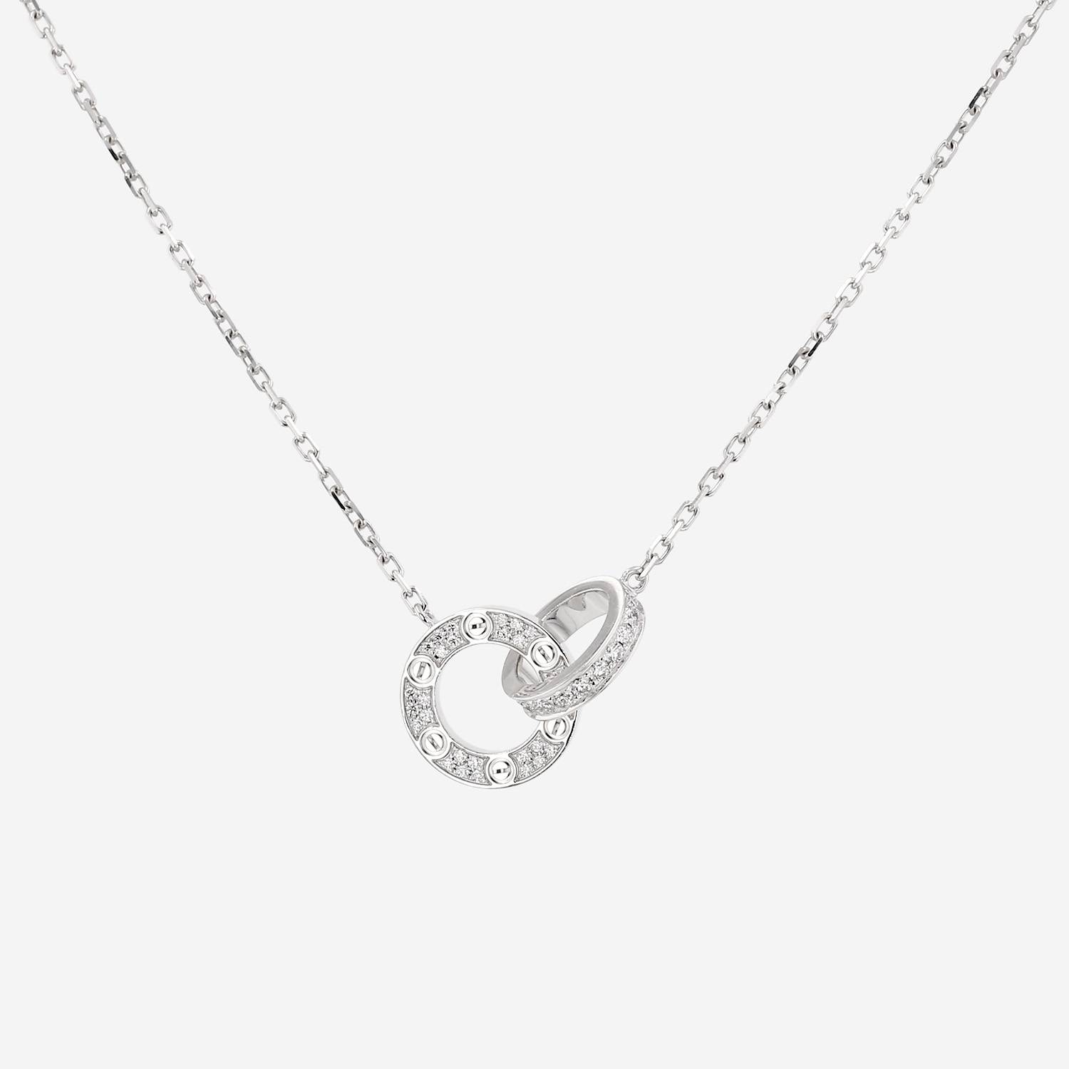 Magnifique collier Cartier Love pavé en or blanc et diamants, composé de 2 élégants anneaux entrelaçés en or blanc, orné de délicats diamants de taille brillant pesant au total 0.30 carat, le tout retenu par une fine chaine à maillons forçat en or blanc.