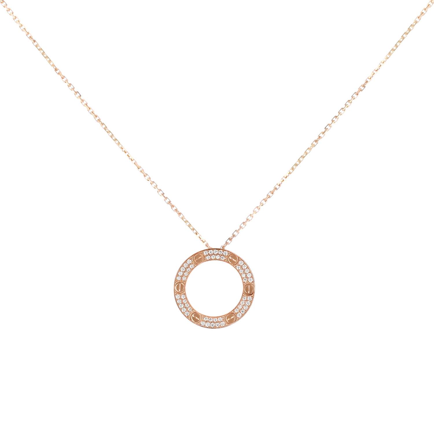 Collier Cartier Love pavé en or rose et diamants, composé d'un motif rond ajouré en or rose délicatement serti de diamants de taille brillant de 0.34 carat au total, retenu par une chaine à maillons forçat en or rose.