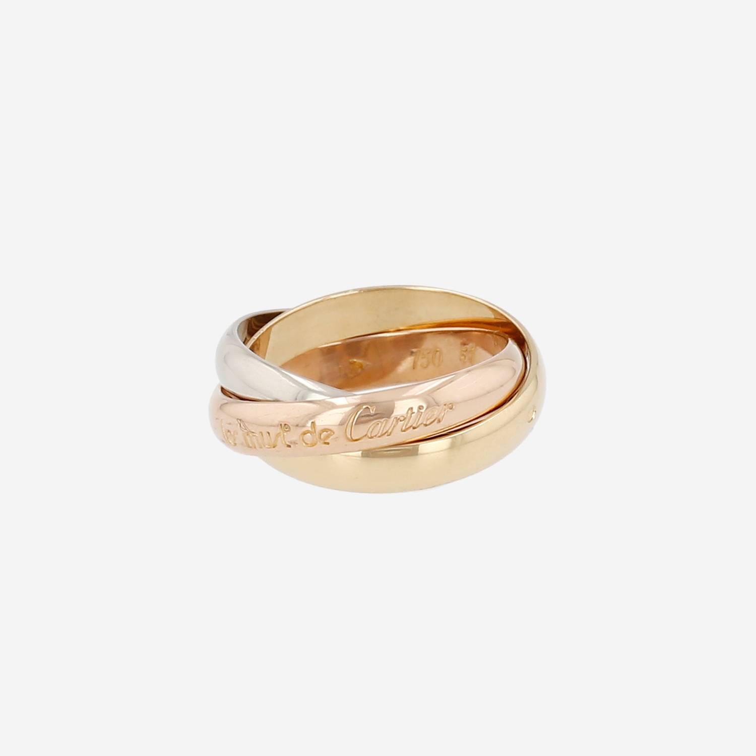 Indémodable bague Cartier Trinity "les Must de Cartier" moyen modèle en 3 ors, composée de 3 élégants anneaux entrelaçés en or jaune, en or rose et en or blanc.