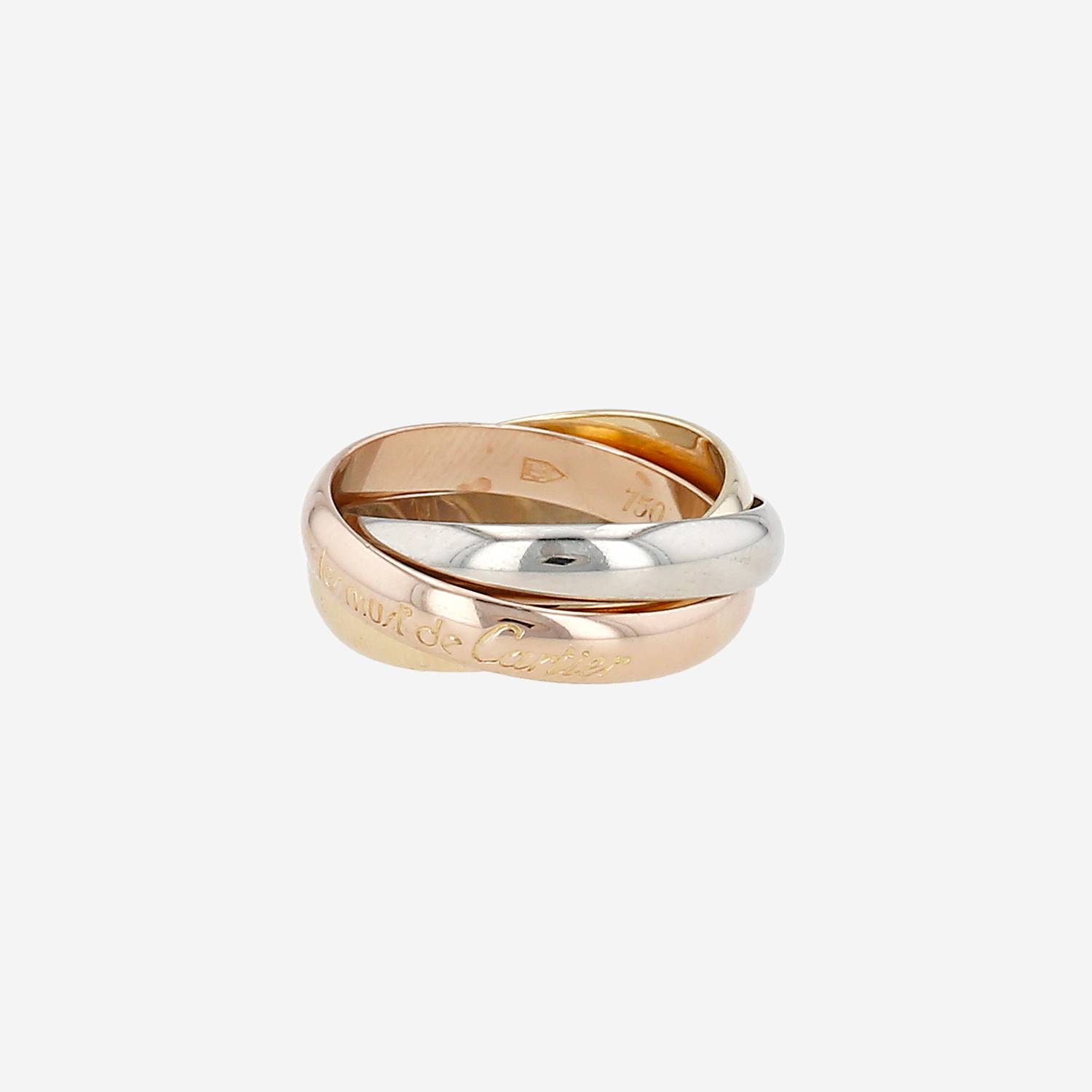 Indémodable bague Cartier Trinity "les Must de Cartier" moyen modèle en 3 ors, composée de 3 élégants anneaux entrelaçés en or jaune, en or rose et en or blanc.