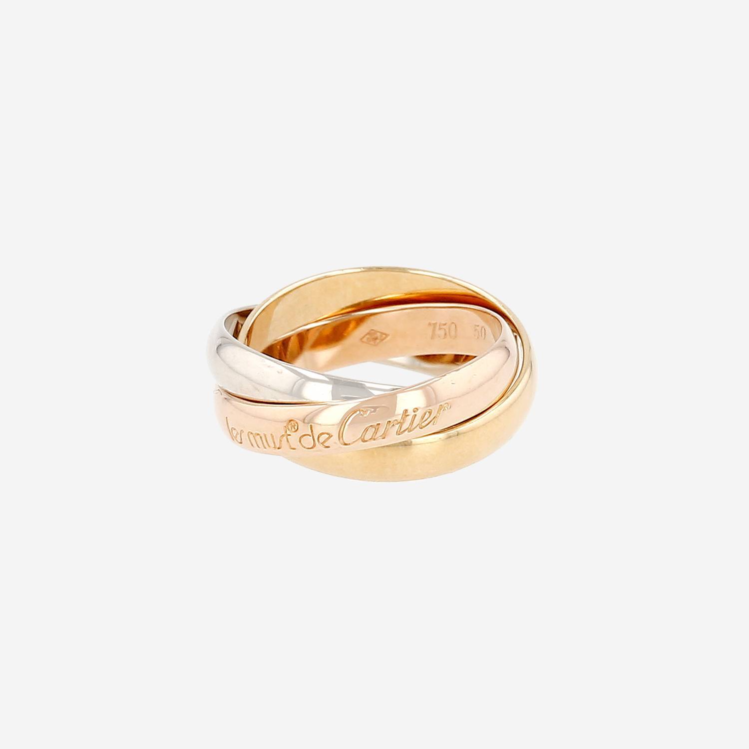 Bague Cartier Trinity "les Must de Cartier" moyen modèle en 3 ors, composée de 3 élégants anneaux entrelaçés en or jaune, en or rose et en or blanc.