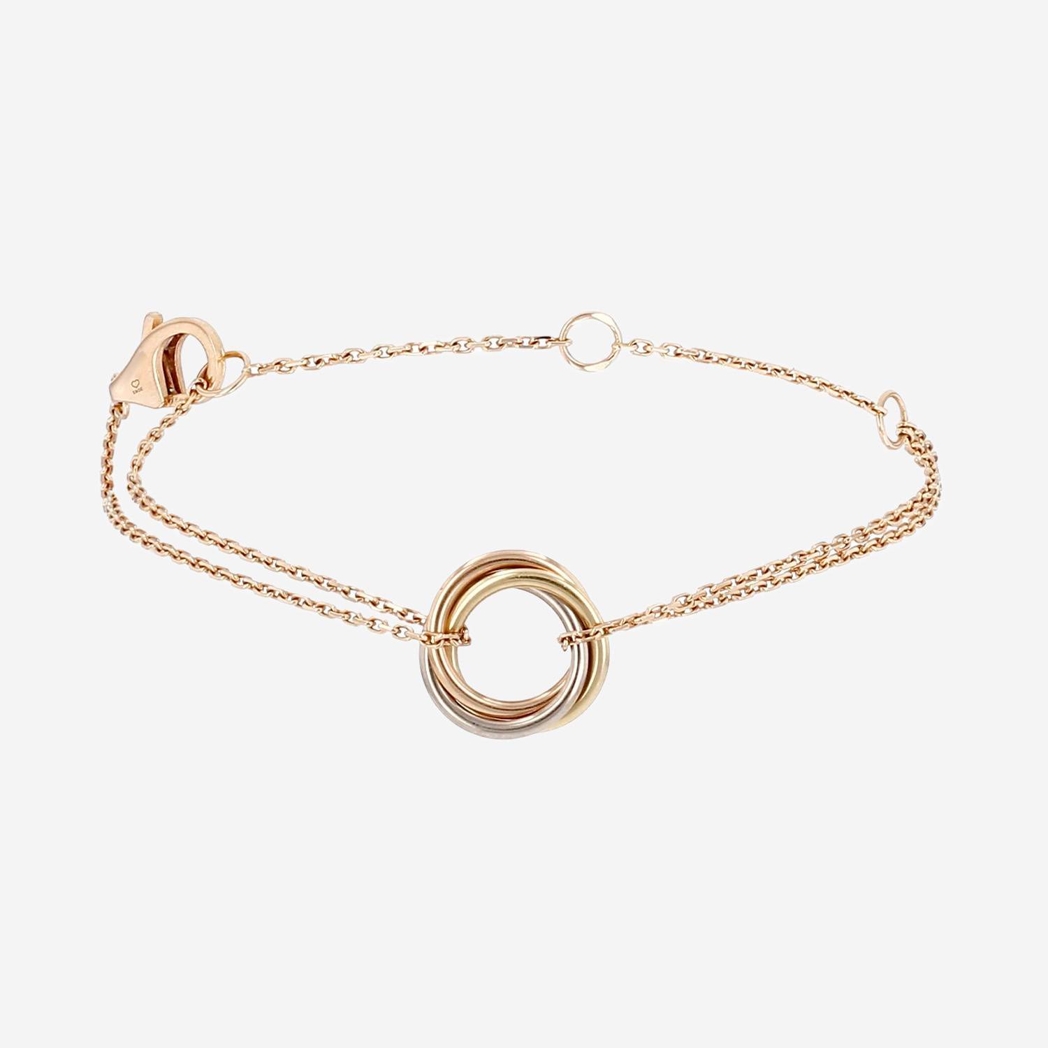 Bracelet Cartier Sweet Trinity en 3 ors, composé de 3 élégants anneaux en or blanc, en or jaune et en or rose, le tout retenu par une double chaine à maillons forçat en or rose.