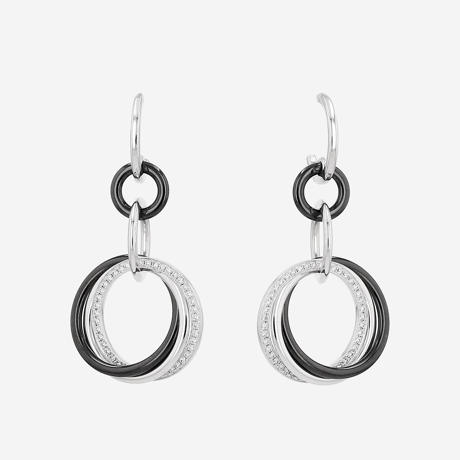 Paire de boucles d'oreilles Cartier Trinity en or blanc, en diamants, et en céramique noire, composée d'une succession d'élégants anneaux entrelaçés en or blanc, en céramique noire, ornée d'un anneau délicatement pavé de diamants de taille brillant.