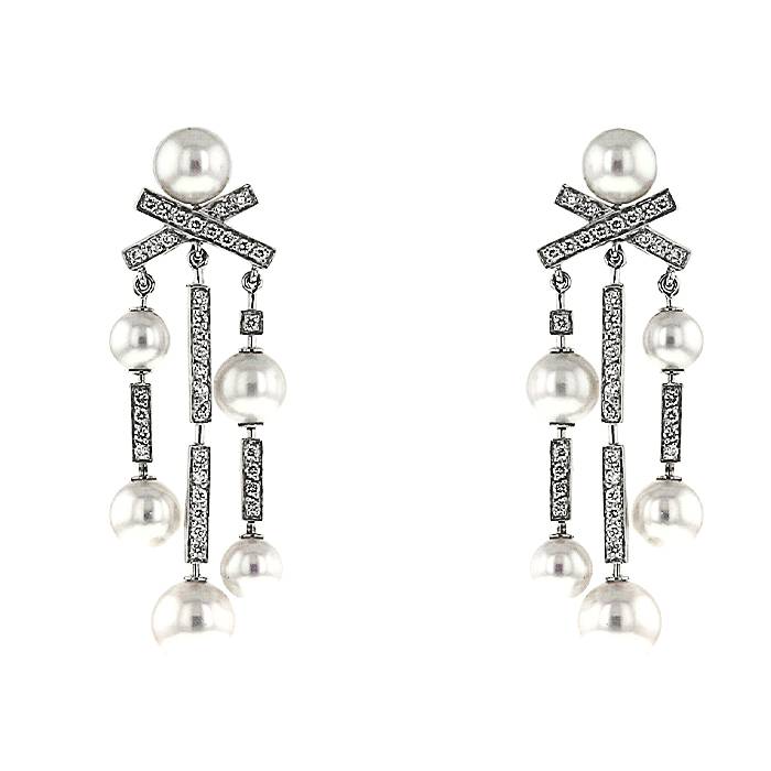 Élégante paire de clips d'oreilles Chanel grand modèle en or blanc, en diamants, et en perles, composée d'une succession de 3 superbes pampilles articulées finement pavées de diamants de taille brillant, ornée d'une alternance de très belles perles de culture, réhaussée sur le dessus de 2 élégants liens croisés délicatement sertis de diamants de taille brillant et d'une perle de culture.