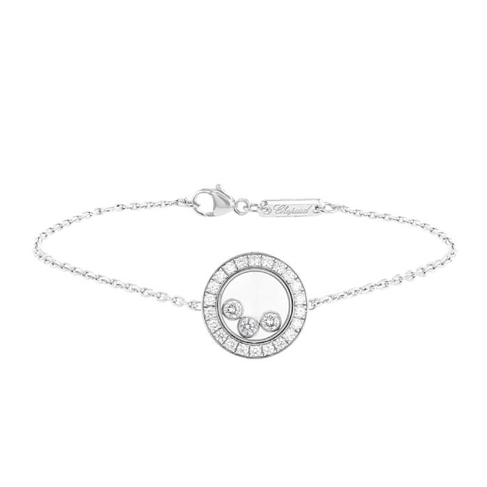 Ravissant bracelet Chopard Happy Diamonds en or blanc et diamants, composé d'un élégant motif central rond en or blanc, orné en son centre de 3 diamants mobiles réhaussés d'une ligne de diamants de taille brillant (0,35 carat), le tout retenu par une fine et délicate chaine en or blanc.