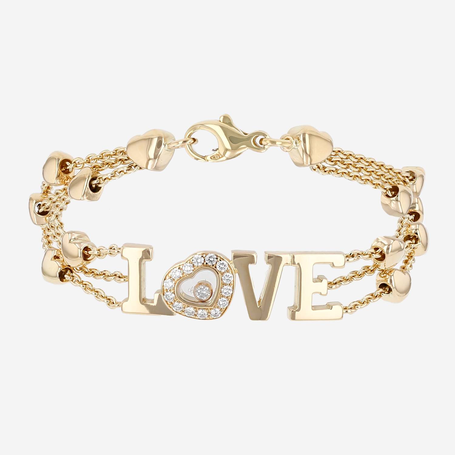 Bracelet Chopard Happy Diamonds en or jaune et diamants, composé d'un motif LOVE en or jaune avec un cœur serti de diamants de taille brillant, orné en son centre d'un diamant mobile de taille brillant d'environ 0,03 carat, réhaussé de 3 chaînes, épaulé d'une succession de cœur en or jaune.
