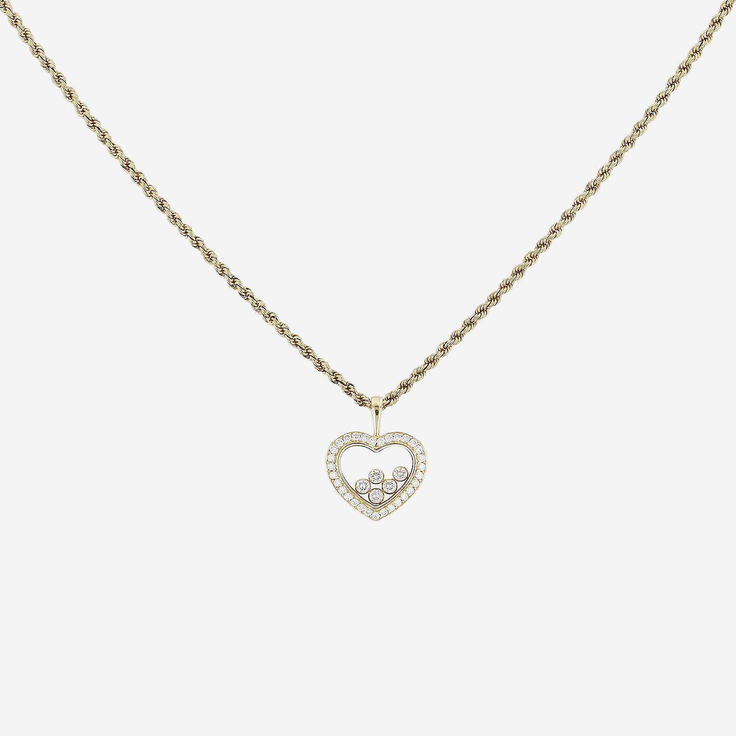 Collier Chopard Happy Diamonds en or jaune et diamants, figurant un cœur ajouré en or jaune délicatement serti de diamants de taille brillant d'environ 0.30 carat et orné en son centre de diamants mobiles de taille brillant pesant environ 0.15 carat au total, le tout retenu par une chaine torsadée en or jaune.
