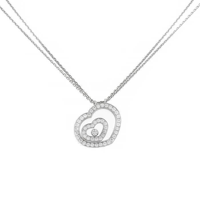 Ravissant collier Chopard Happy Spirit en or blanc et diamants, composé en son centre d'un magnifique cœur ajouré en or blanc entièrement serti de diamants de taille brillant, orné en son centre d'un joli cœur mobile en or blanc délicatement serti de diamants de taille brillant, réhaussé en son centre d'un diamant mobile de taille brillant, le tout retenu par des chaines en or blanc.