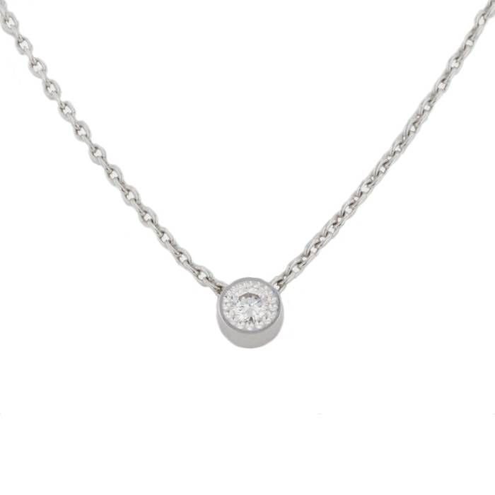 Délicat collier en or blanc et diamant, composé d'un charmant petit pendentif rond serti d'un diamant de taille brillant de 0.10 carat environ, retenu par une fine chaine à maillons forçat en or blanc.