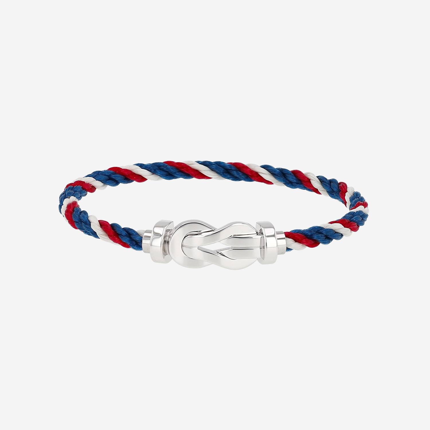 Bracelet Fred Chance Infinie grand modèle en or blanc et nylon, composé d'un élégant motif de huit symbolisant l'infini en or blanc, réhaussé d'un beau cable torsadé en nylon bleu, blanc et rouge.