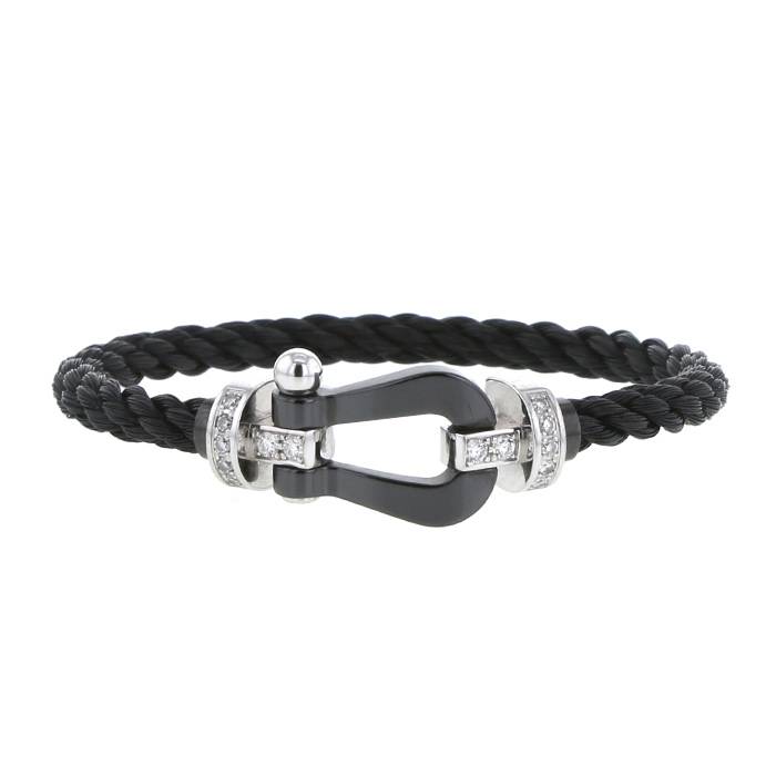 Indémodable bracelet Fred Force 10 grand modèle en or blanc, en diamants, et en céramique noire, figurant une élégante manille géométrique en céramique noire partiellement pavée de diamants de taille brillant, réhaussé d'un important cable torsadé en nylon noir.