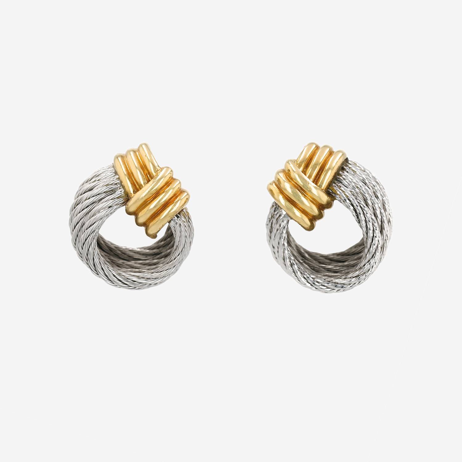 Paire de boucles d'oreilles époque années 1980 Fred Force 10 en or jaune et acier, composée d'une superposition de beaux câbles torsadés en acier, réhaussés sur le dessus d'élégants motifs godronnés en or jaune.