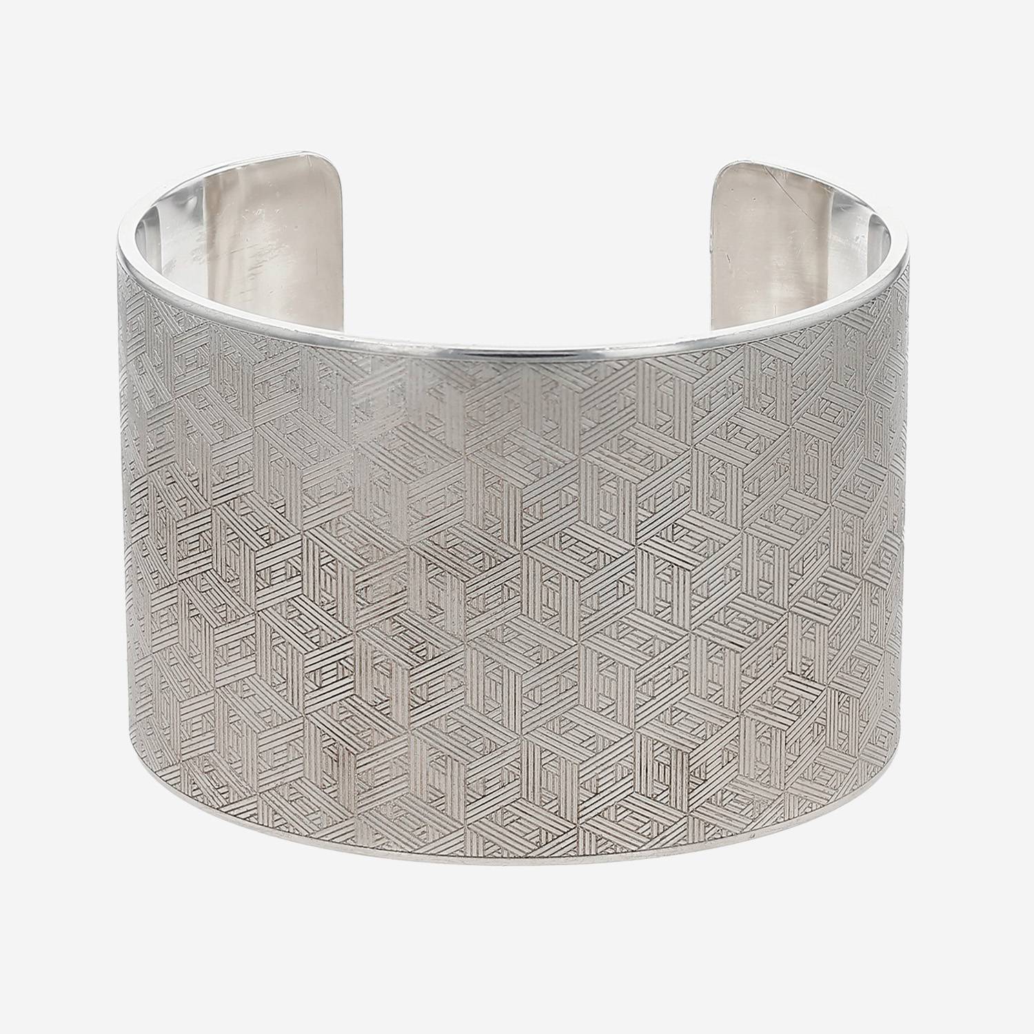 Superbe bracelet manchette Hermès en argent, composé d'une importante monture ouverte, orné d'une alternance de lettres H géométriques gravées.