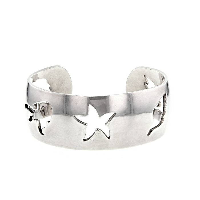 Élégant bracelet manchette moyen modèle en argent, composé d'un ravissant bandeau bombé, orné de 5 élégants motifs géométriques ajourés.