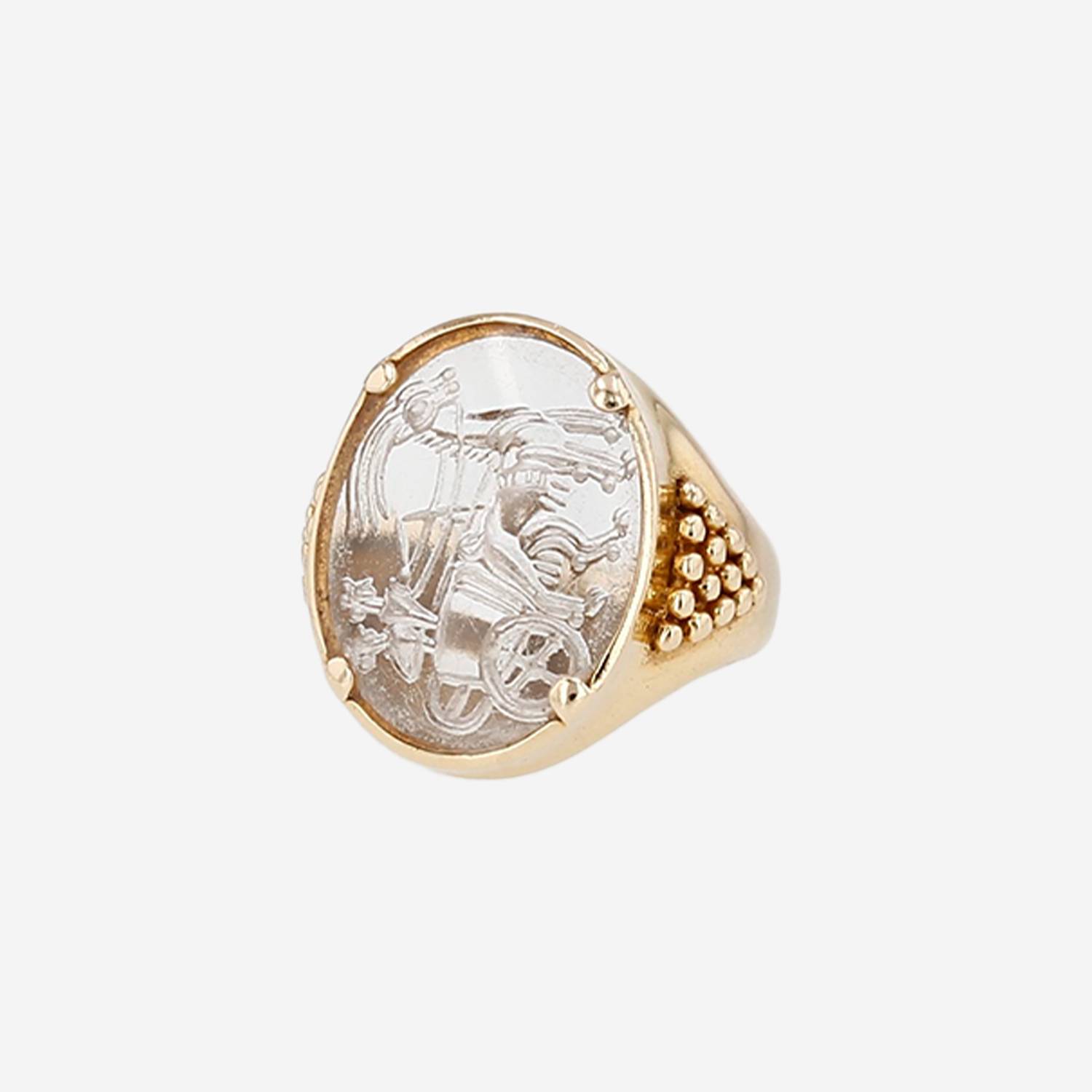 Bague Lalaounis en or jaune et cristal de roche, composée d'un anneau en or jaune, ornée d'une intaille gravée en cristal de roche.