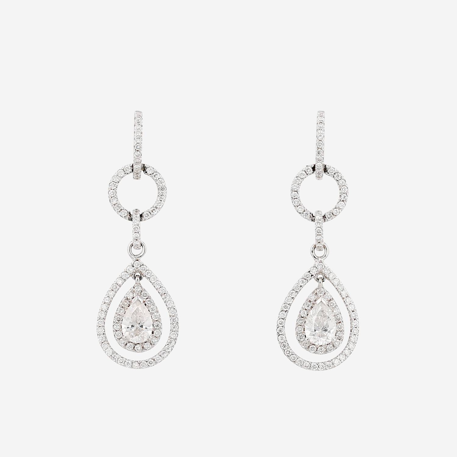 Paire de boucles d'oreilles Messika Emporium en or blanc et diamants, composée de motifs géométriques articulés ajourés en or blanc finement sertis de diamants de taille brillant 0.73 carat de au total, ornée en leur centre de très beaux diamants de taille poire pesant au total 0.85 carat.