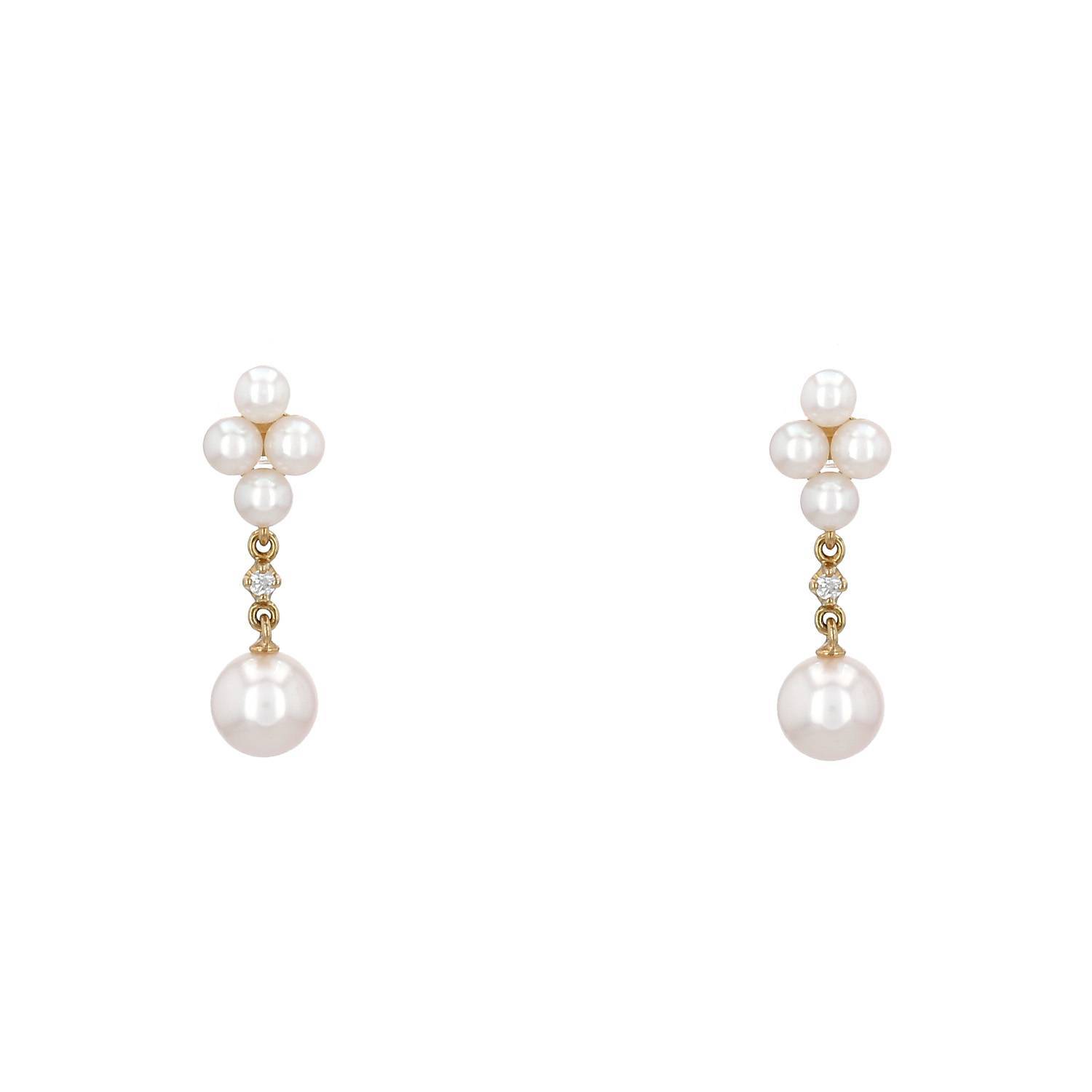 Paire de boucles d'oreilles Mikimoto en or jaune, en perles de culture Akoya, et en diamants, composée de losanges sertis de petites perles de culture Akoya, ornées à la base de pampilles articulées retenant une perle de culture Akoya réhaussées d'un petit diamant de taille brillant.