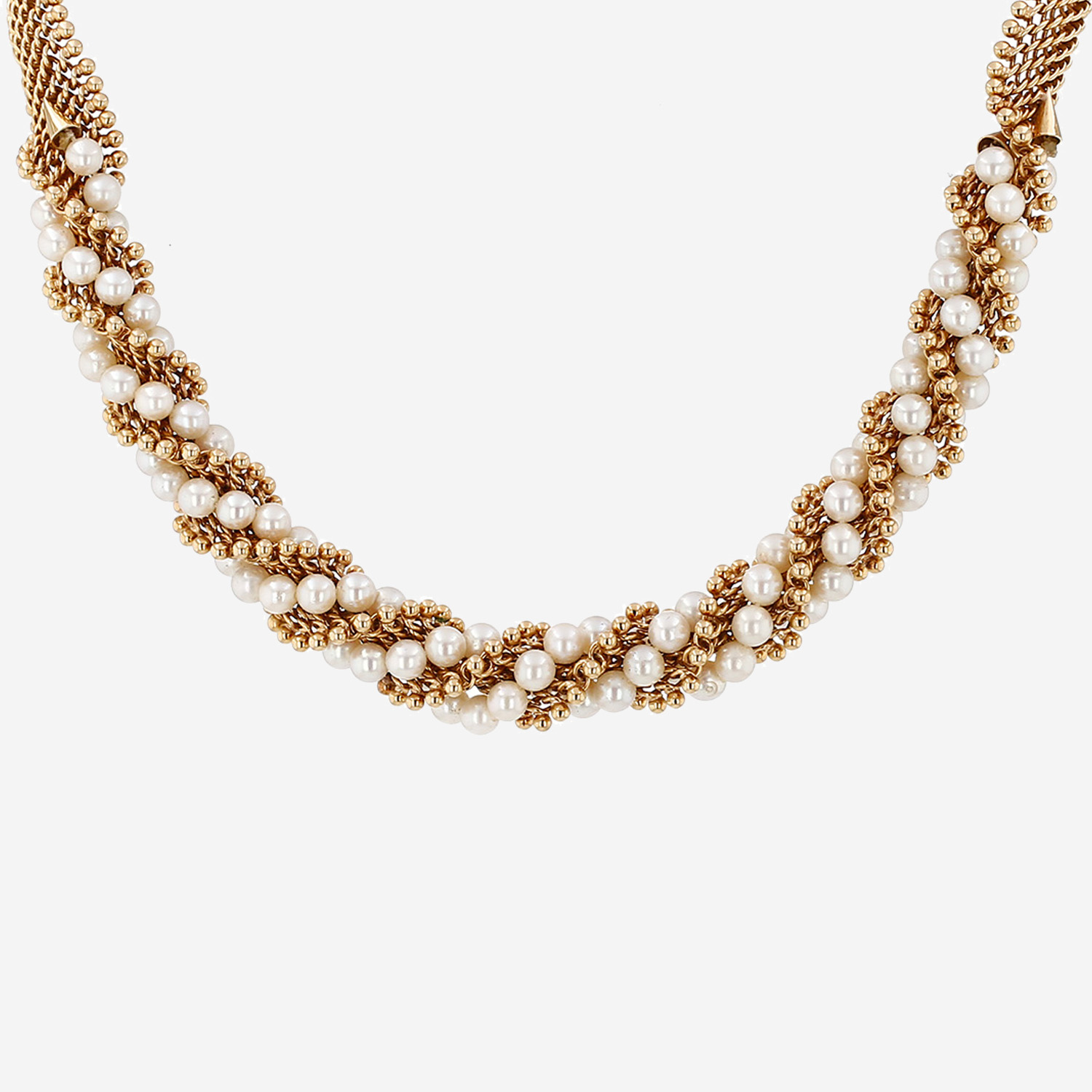 Collier époque années 1960 Piaget en or jaune et perles de culture, composé d'une très belle maille torsadée en or jaune, et réhaussé de perles de culture.