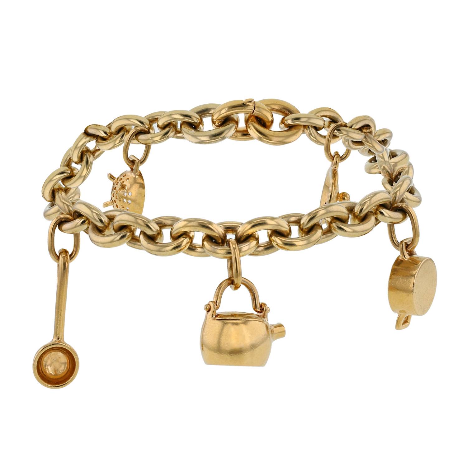 Bracelet Pomellato en or jaune, composé d'une succession de ravissantes breloques en or jaune : égouttoir, louche, bouilloire, casserole et couvercle, le tout retenu par une belle une chaine à maillons ronds en or jaune.