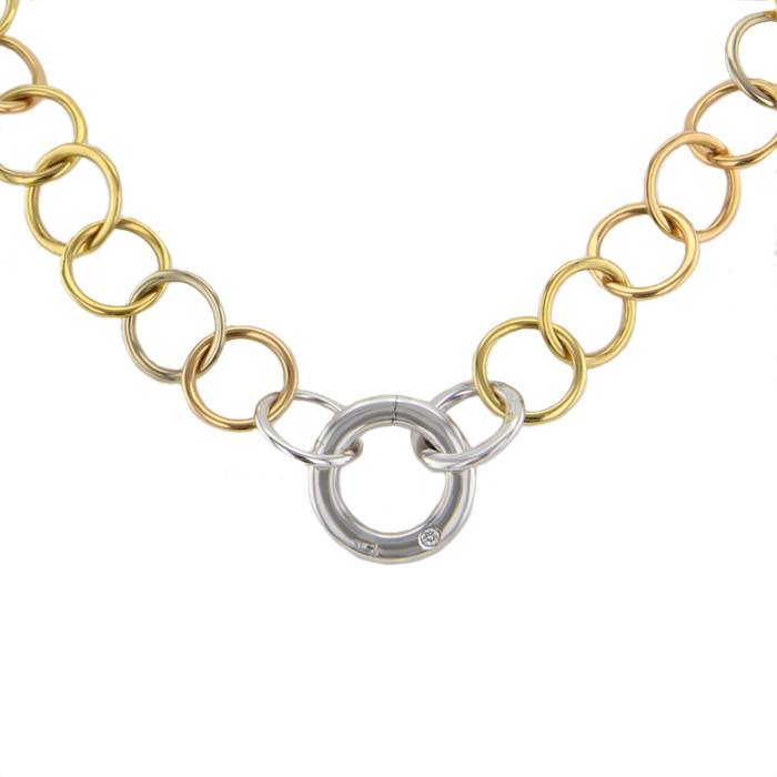 Superbe collier de la collection "Lucciole" en or blanc, en or rose, et en or jaune, composé d'une succession de élégants anneaux ronds en or jaune, en or rose et en or blanc, orné en son centre d'un important anneau en or blanc délicatement serti d'un diamant de taille brillant.