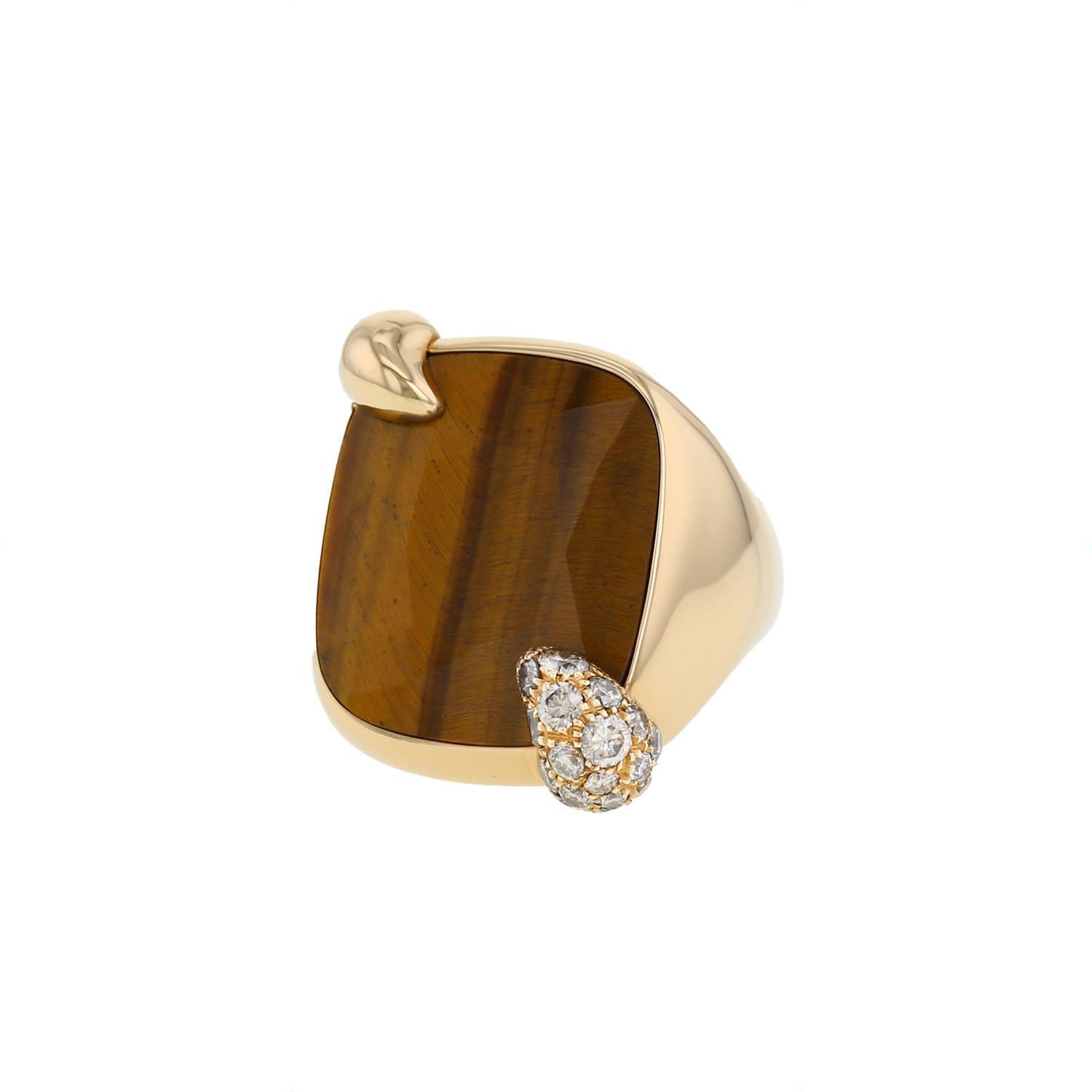Bague Pomellato Ritratto moyen modèle en or jaune, en quartz oeil de tigre, et en diamants, composée d'une belle monture bombée en or jaune, ornée d'un important quartz oeil de tigre facetté, réhaussée d'une petite griffe délicatement sertie de diamants bruns de taille brillant.