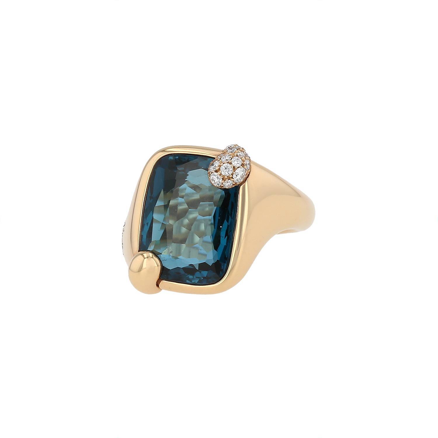 Bague Pomellato Ritratto petit modèle en or rose, en topaze bleue, et en diamants, composée d'une monture en or rose, ornée d'une très belle topaze bleue London facettée, réhaussée de petites griffes partiellement serties de diamants de taille brillant.