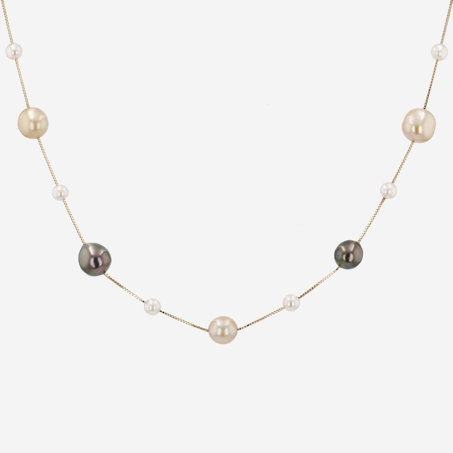 Sautoir Tasaki en or jaune et perles de culture, composé d'une alternance de délicates perles de culture blanches, de perles de culture des Mers du Sud et de perles de culture de Tahiti, le tout retenu par une fine chaine maille venitienne en or jaune.