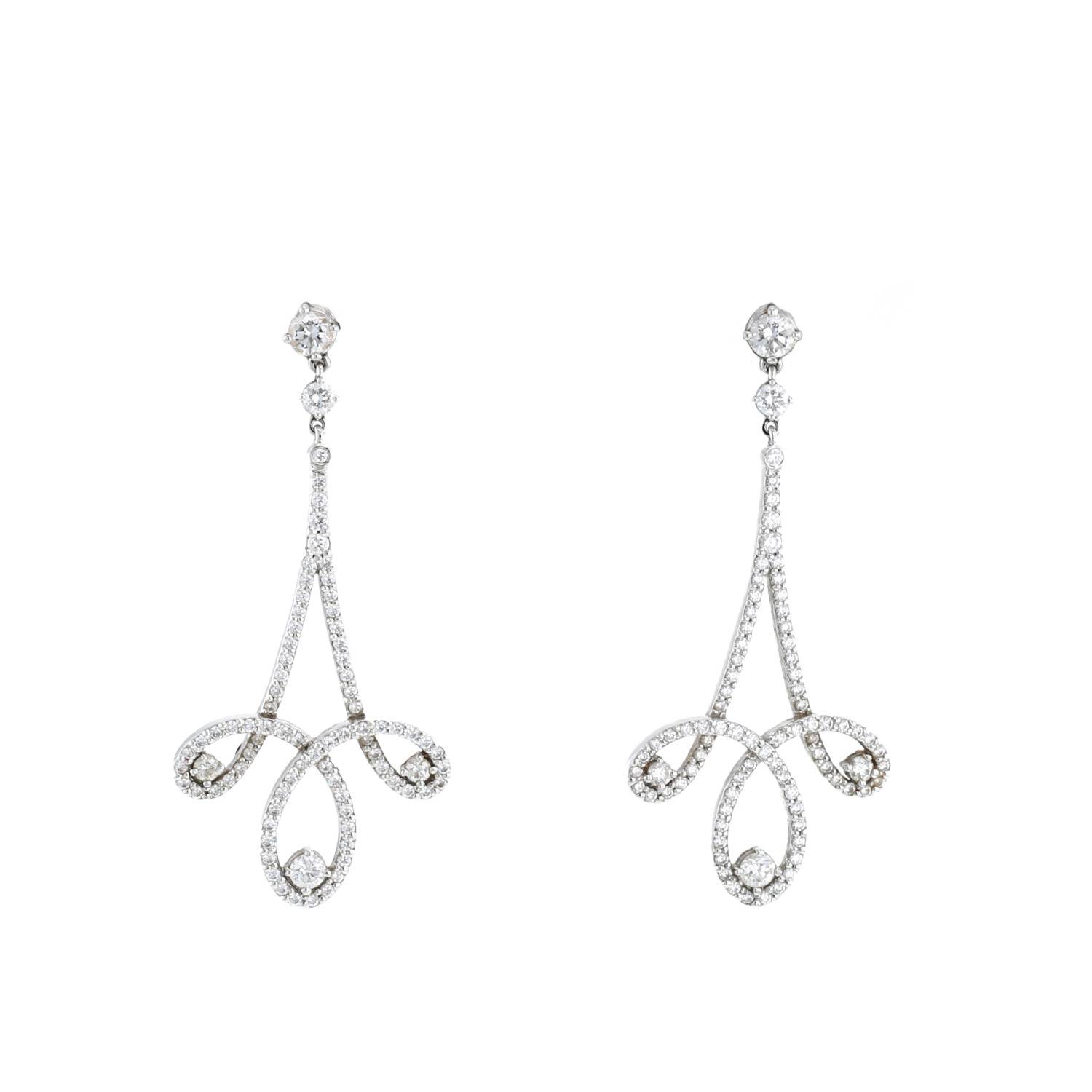 Paire de pendants d'oreilles Tiffany & Co en platine et diamants, composée de 2 motifs mouvementés en platine entièrement sertis de diamants de taille brillant de 1.2 carat environ.