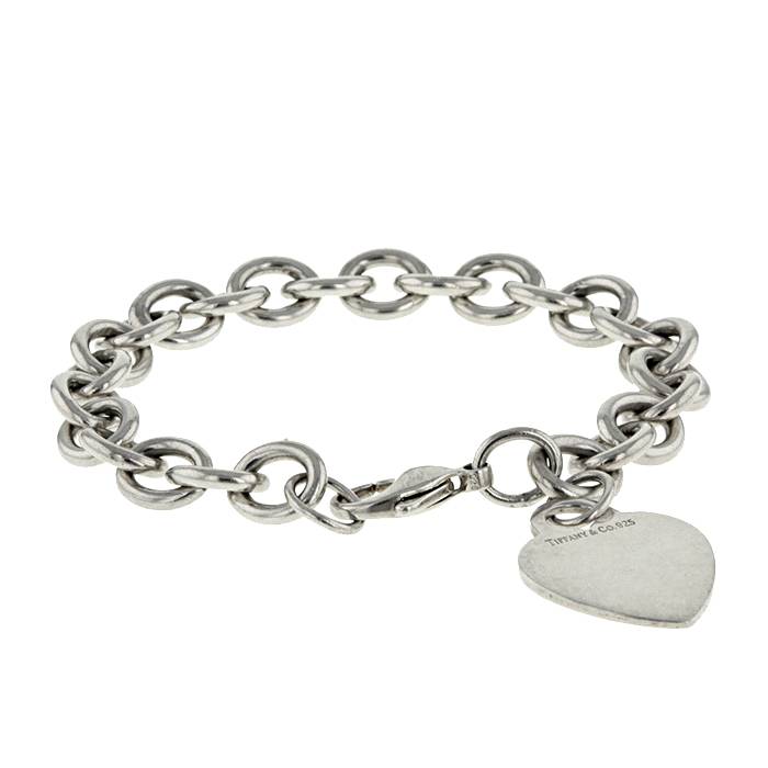 Ravissant bracelet Tiffany & Co Return To Tiffany en argent, composé d'un élégant cœur gravé "Tiffany & Co", retenu par une superbe une chaine à maillons ronds en argent.
