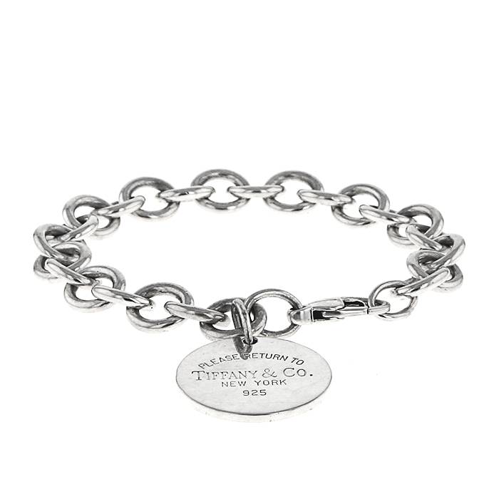 Ravissant bracelet Tiffany & Co Return To Tiffany en argent, composé d'une élégante plaque ronde gravée "Please Return To Tiffany & Co New York, retenu par une chaine à maillons ronds en argent.