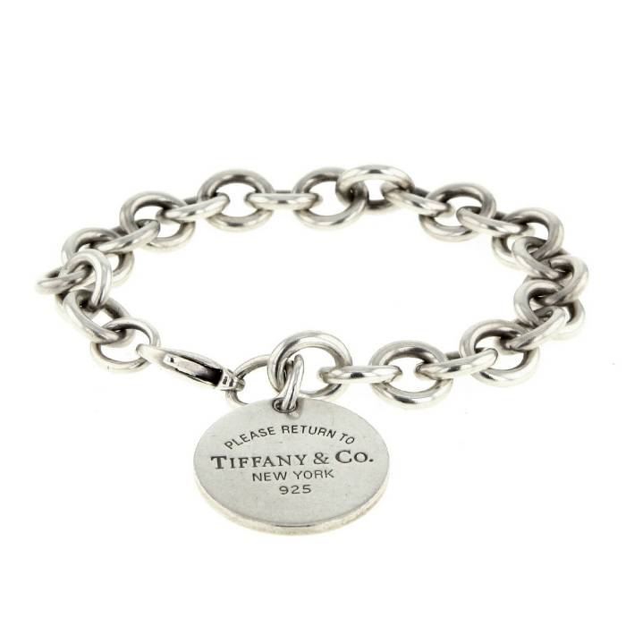 Ravissant bracelet de la collection "Return To Tiffany" en argent, composé d'une élégante plaque ronde gravée "Please Return To Tiffany & Co New York, retenu par une superbe une chaine à maillons ronds en argent.