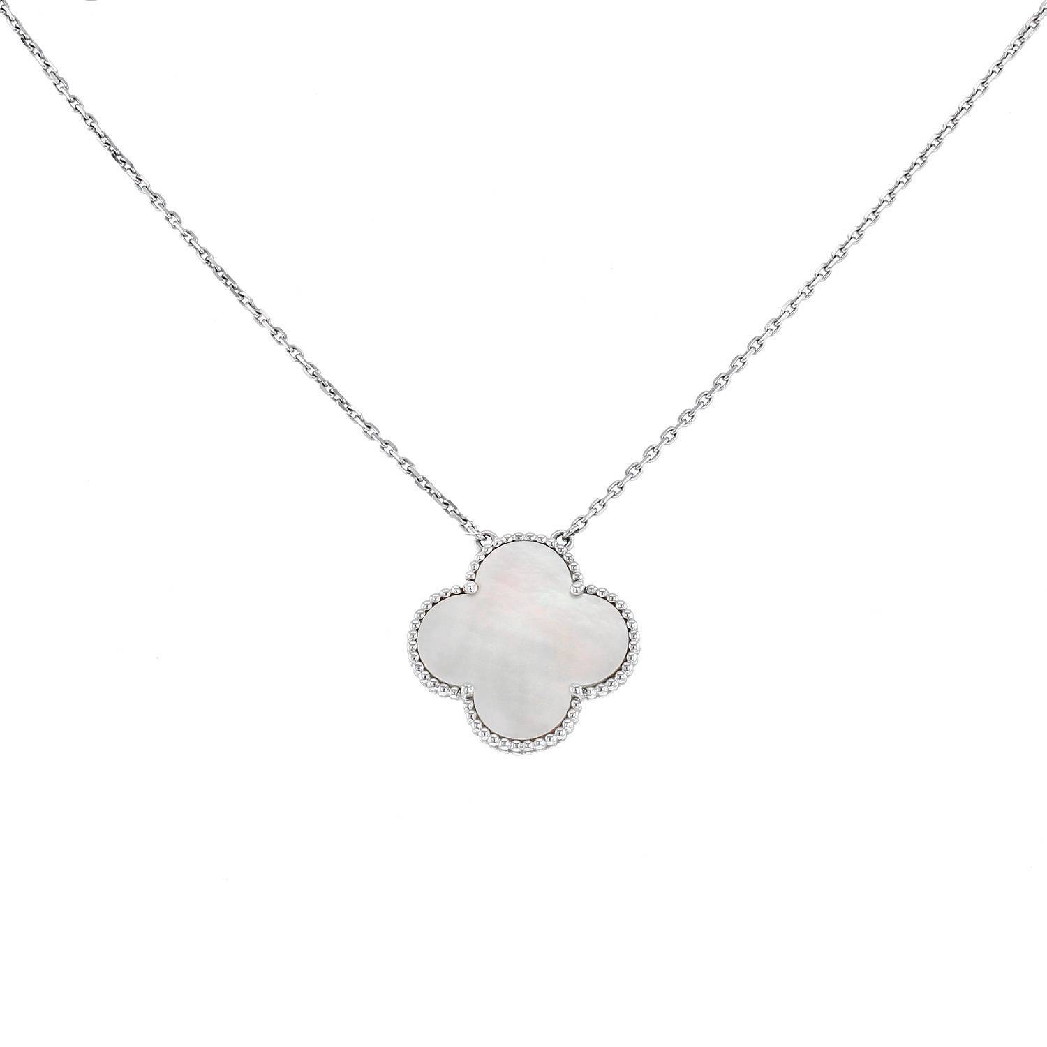 Collier Van Cleef & Arpels Magic Alhambra en or blanc et nacre, composé d'un large trèfle en nacre, réhaussé d'une élégante bordure perlée en or blanc, le tout retenu par une chaine en or blanc.