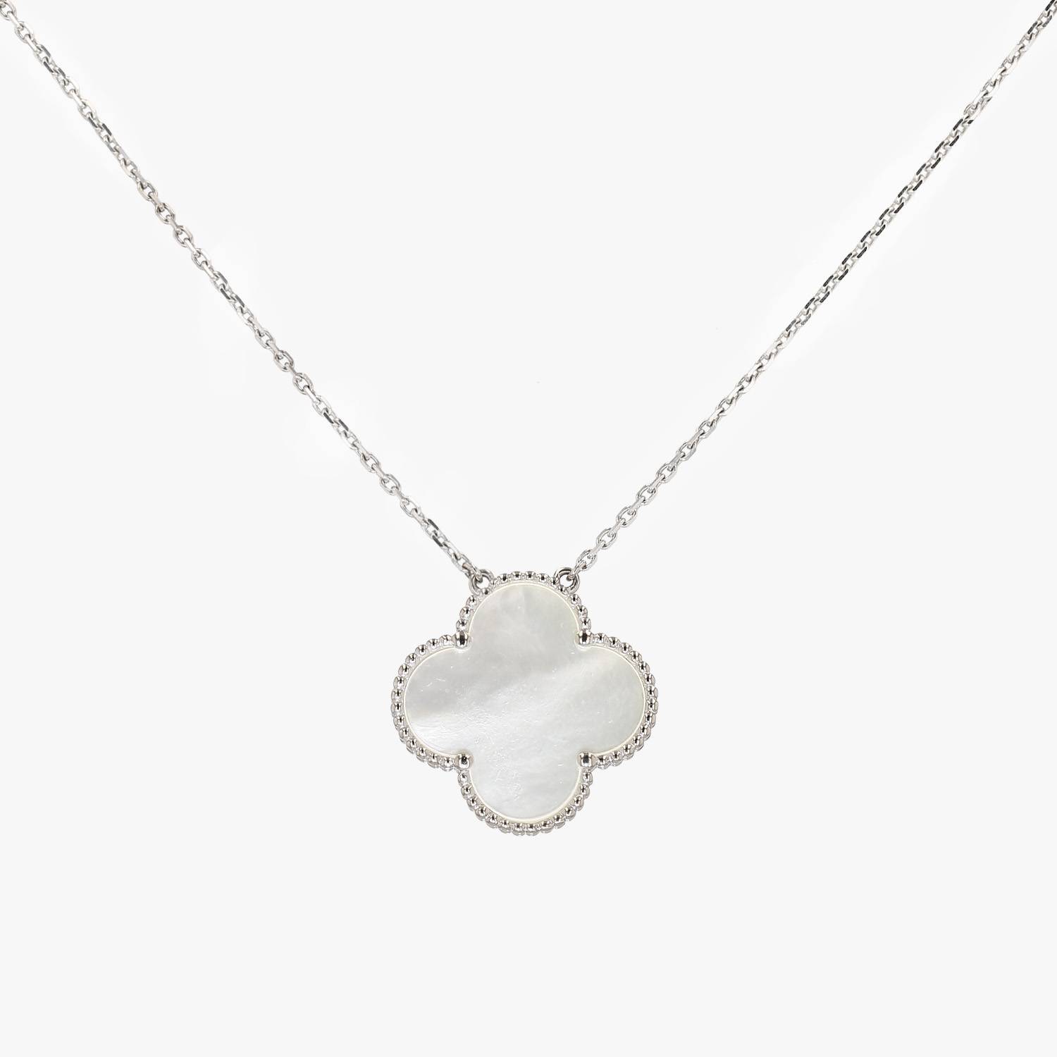 Collier Van Cleef & Arpels Magic Alhambra en or blanc et nacre, composé d'un important trèfle quadrilobé en nacre, orné d'une délicate bordure perlée en or blanc, retenu par une chaine à maillons forçat en or blanc.