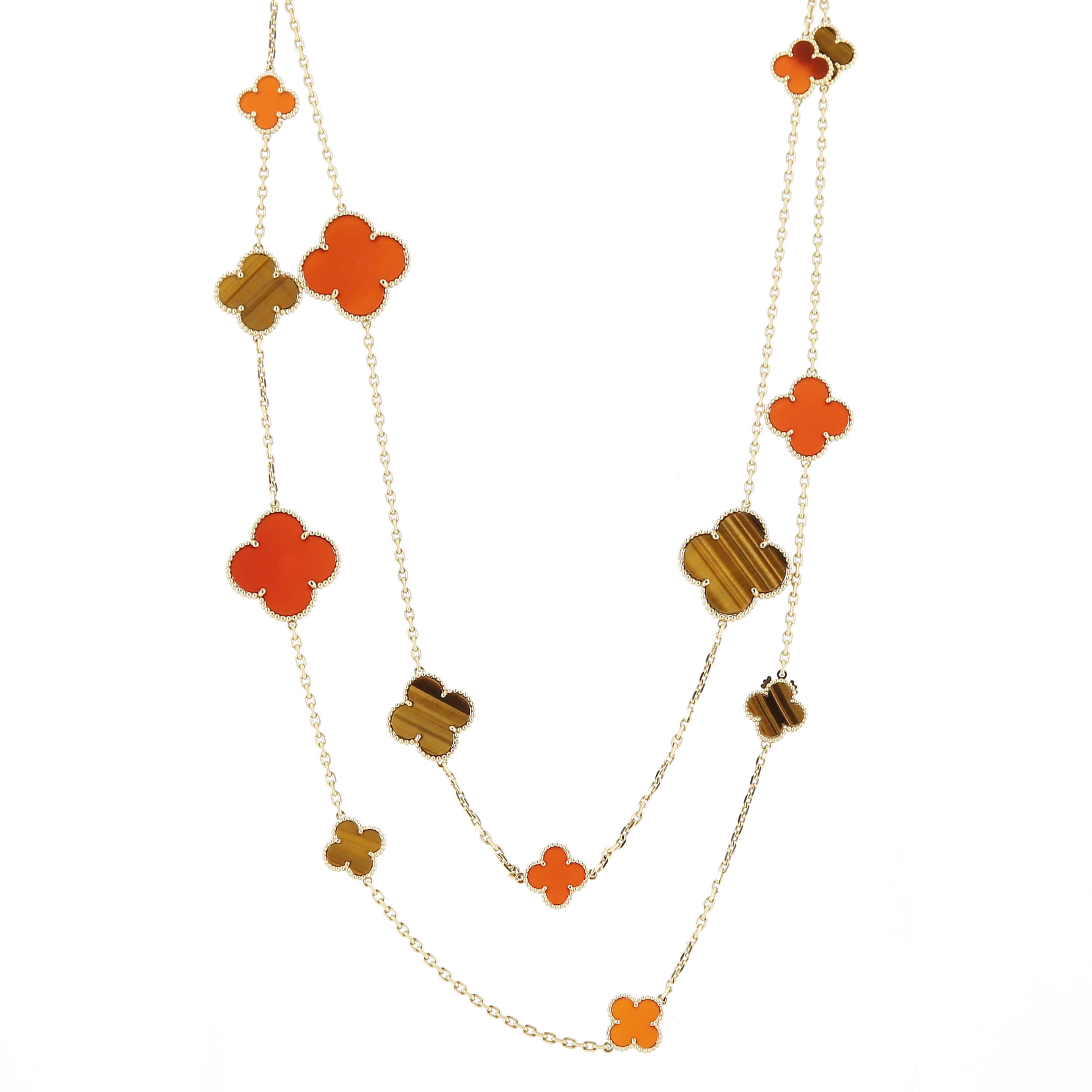 Superbe sautoir Van Cleef & Arpels Magic Alhambra en or jaune, en cornaline, et en oeil de tigre, composé d'une alternance de 16 beau motif de trèfle quadrilobé en cornaline et en oeil de tigre, orné d'une fine bordure perlée en or jaune, le tout retenu par une élégante chaine à maillons forçat en or jaune.